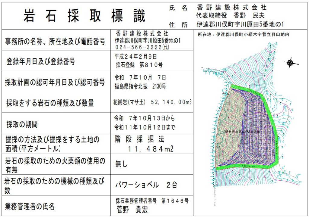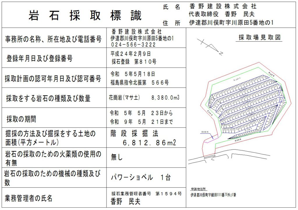 採石法および砂利採取法の『標識の表示』 2025年10月27日 令和6年4月1日付の採石法(昭和25年法律第291号)及び採石法施行規則(昭和26年通商産業省令第6号)の改正に伴い、岩石採取標識を掲示します。