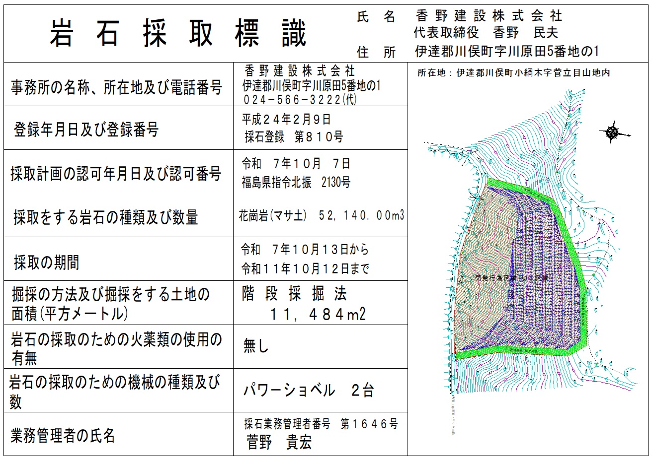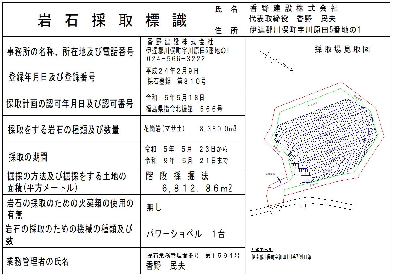 採石法および砂利採取法の『標識の表示』 管理者 23時間 ago 令和6年4月1日付の採石法(昭和25年法律第291号)及び採石法施行規則(昭和26年通商産業省令第6号)の改正に伴い、岩石採取標識を掲示します。